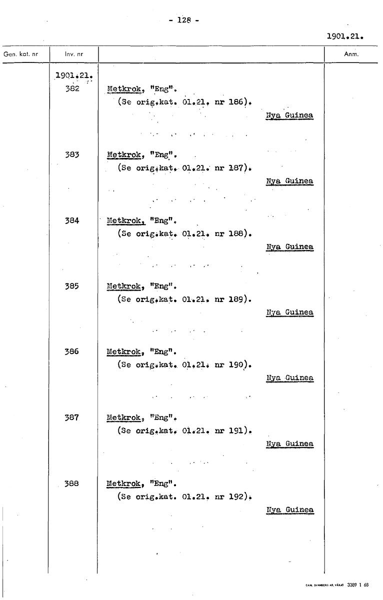 • -128- 1901.21. 19014214 382 Metkrok, "Eng". (Se origekat. 01.21. nr 186). ag Guinea 383 Metkrok, "Eng". (Se orig.kat. 01.21.' nr 187). Nya Guinea 384 ' Metkrok, "Eng". (Se orig.kat4 01.21. nr 188), Ny... Visa hela