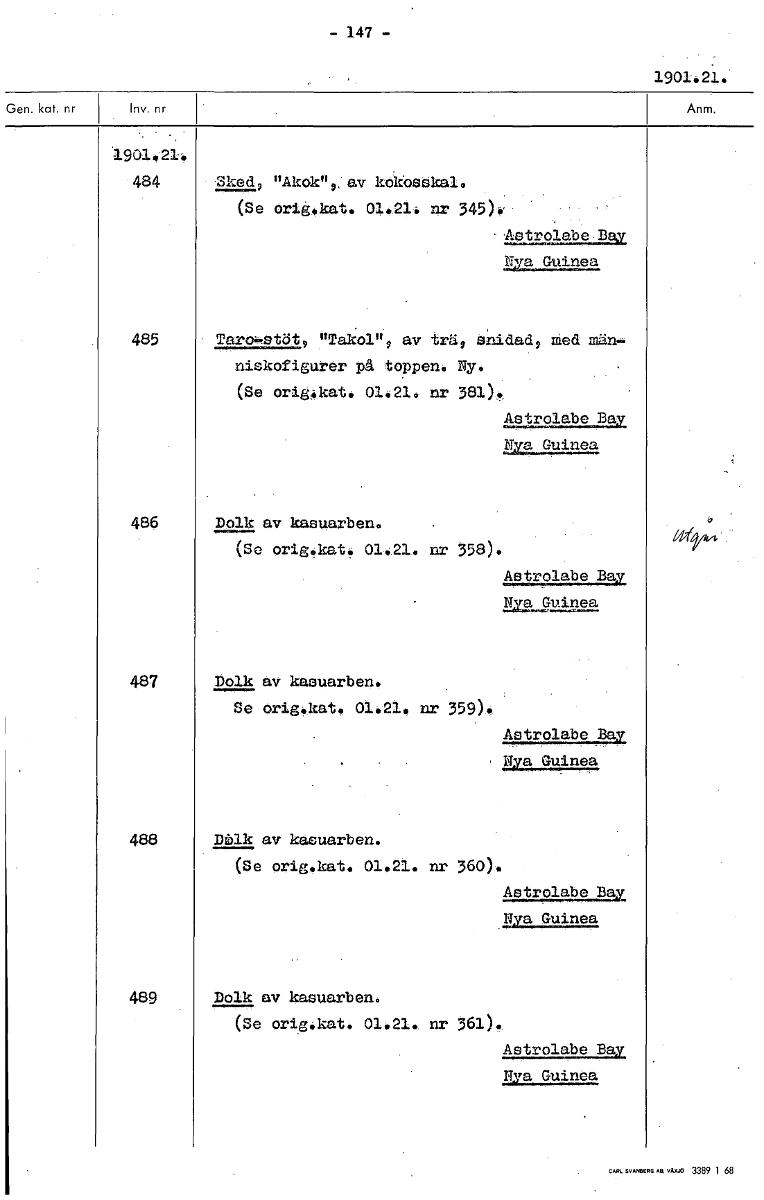- 147 - 1901.21. 1901,214 484 Sked, "Akok",:av kokosskal. (Se orig .kat. 01.21. nr 345):' ..Astrolabe Bay 485 Taro-stöt, "Takol", av trä, snidad, med män- niskofigurer på toppen. Ny. (Se origåkat. 01.21* nr 381). Astrolabe Bay MY91...Quineg. 486 D^olk av kasuarben. (Se orig.kat. 01.21. nr 358). Astrolabe Baz gya Guinea 487 Dolk av kasuarben: Se orig4kat. 01.21. nr 359). Astrolabe Bay Nya Guinea 488 Dälk av kasUarben. (Se orig.kat. 01.21. nr 360). Astrolabgjst 221411984 489 Dolk av kasuarben. (Se orig:kat. 01.21. nr 361)f- Astrolabe Bay Nya Guinea [ocr]