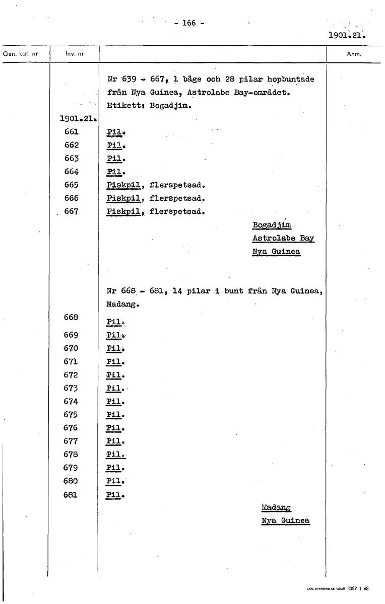 - 166 - 1901:21. Nr 639 667, 1 båge och 28 pilar hopbuntade från Nya Guinea, Astrolabe Bay-området. Etikett: Bogadjim. 1901.21. 661 Pil. 662 663 Pil, 664 Pil. 665 PiekDil, flerspetsad. 666 flerspetead. 667 Piskpil, flerspetsad. Bogadiim Astrolabe Bay Nya Guinea Nr 668 - 681, 14 pilar i bunt från Nya Guinea, Madang. 668 Pil. 669 Pil. 670 Pil* 671 Pil. 672 Pil. 673 Pil. 674 Pil. 675 Pil. 676 Pil. 677 Pil, 678 Pil. 679 Pil, 680 Pil. 681 Pil. Madang Nya Guinea [ocr]