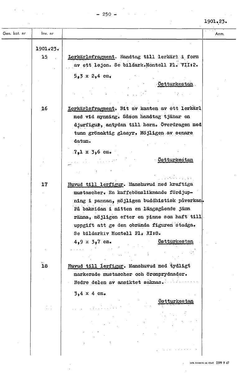 250 1901.23. 19014.23e 15 Lerkärlsfragment. Handtag till lerkärl i form av ett ,lejon. Se bildark.Mentell 5 3 x 2,04 cm. östturkestan_ 16 Leriment. Bit av kanten av ett lerkärl med vid mynning. ååöom ...