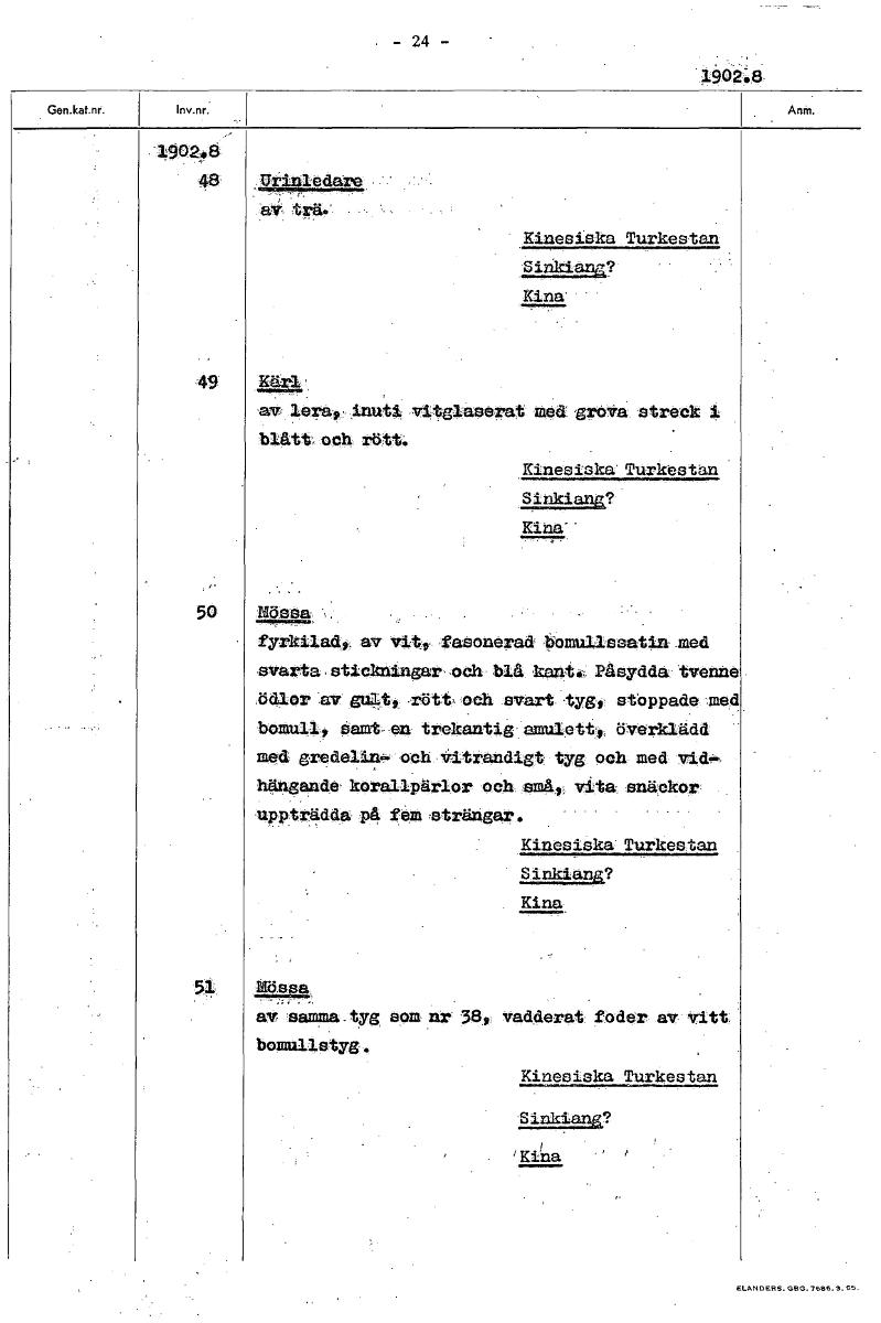 • - 24 - 4902.98 48 Urinledare • a: Kinesiska Turkestan Sinklang? Kina 49 31 av lera, inuti vitglaaerat med grata 'streck i blått och rött. Kinesiska Turkestan Sinkiane Kina' . . 50 Mosa fyrkilad,. av v... Visa hela