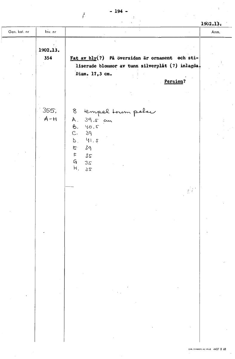 • - 194 - 1902.14. 1902.13. 354 Fat av bly(?) På översidan är ornament och sti- liserade blommor av tunn silverplåt (7) inlagda Diam. 17,3 cm. Persien? 3s5-, A -H . e. 9,(9 C. 101 30) 3S 3S3 E H. as [oc... Visa hela