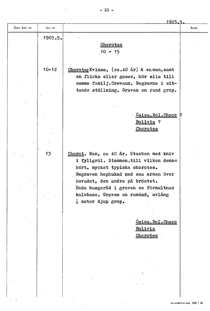 23 1903. 1903.5. Chorotes 10 - 15 10-12 Chorotes Kvinna, (ca.40 år) & enman,samt en flicka eller gosse, hör alla till samma familj,Crevaux. Begravna i sit- tande ställning. Graven en rund grop. Caiza,...