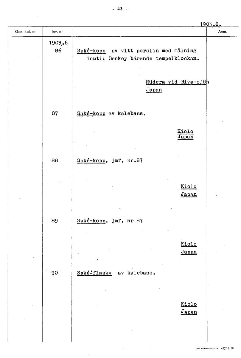 • - 43 - 1903.6. 1903:.6: 86 Sakg-kopp av vitt porslin med målning inuti: Benkey bärande tempelklockan. Pin:lera vid Biva-sjö Japan 87 Sak&-kopp av kalebass Kiolo Japan 88 Sakg-kopp, jmf. nr.87 Kiolo Ja... Visa hela