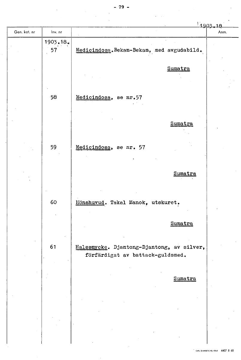 -79- '1903.18 1903.18 57 Medicindosa.Bekam-Bekam, med avgudabild. Sumatra 58 Medicindosa, se nr.57 Sumatra 59 Medicindosa, se nr. 57 Sumatra 60 Hönshuvud. Takal Manok, utskuret. Sumatra 61 Halssmycke....