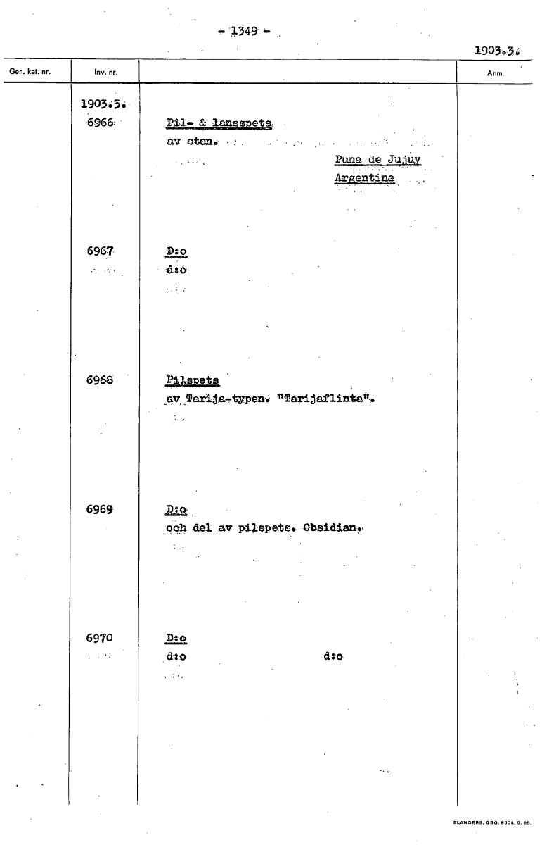 • - 1349 .1903-.34. 1903.3-4 6966. & lansspets av sten. Puna de Jujuy. Argentina 6967 D:o d:o 6968 Pilspets av Ttarija-rtypen. arijafl.intans 6969 oo4 del av pilspets. Obsidiany 6970 låg dso •dso [ocr]