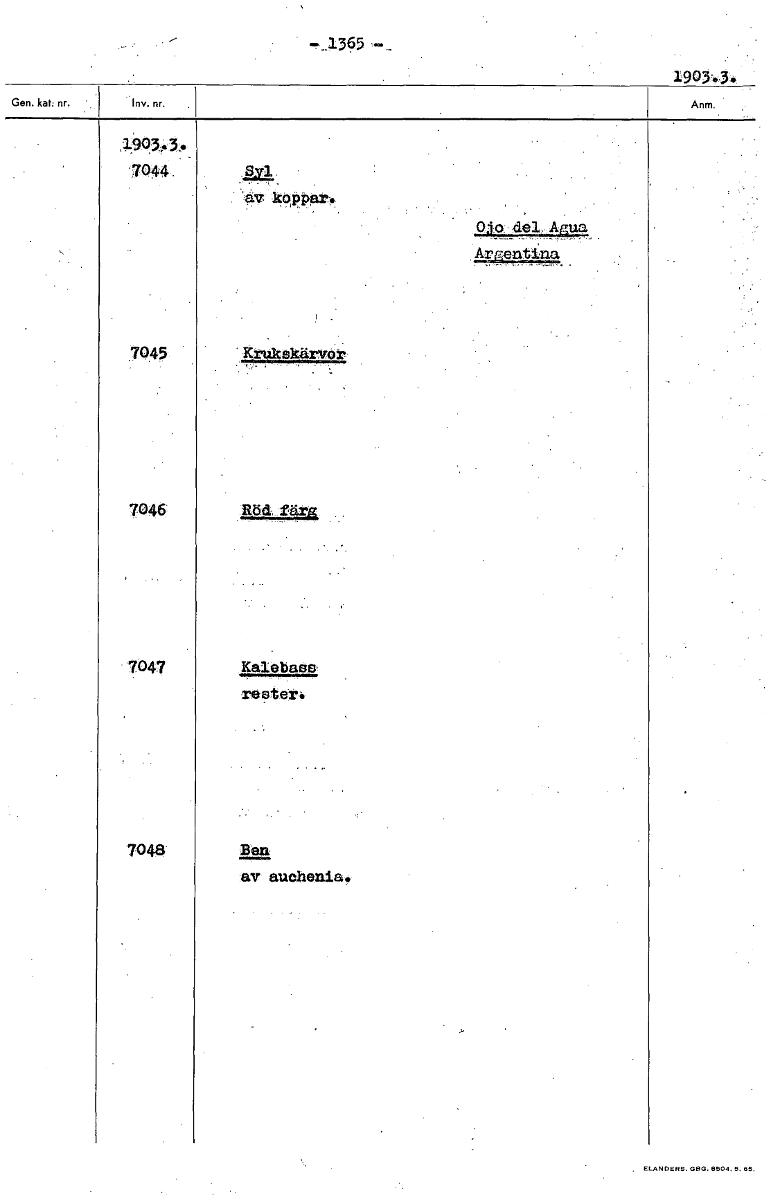 • - 1365 1903,3 *7044. 'av kona?. .44.49___ 1A g. „.,u_g_ Arerrta 7045 Krukskärvor 7046 Röd, färg 7047 Kalebass rester. 7048 Ben av auchenia. [ocr]