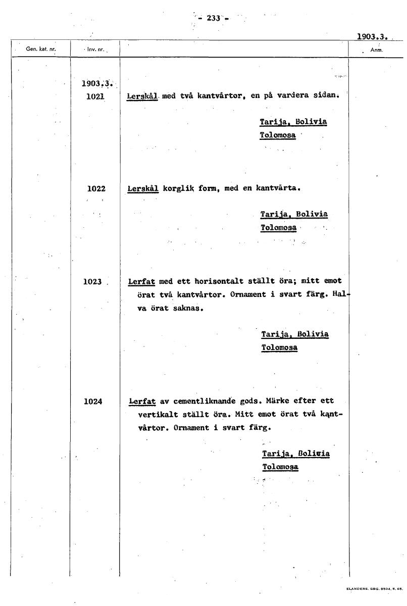 • - 233 - 1903.3... 1021. Leråkåls med två kantvårtor, en på vardera sidan. Tariia, Bolivia Tolomosa 1022 Lerskål korglik form, med en kantvårta. TariJa, Bolivia Tolomosa 1023. Lerfat med ett horisontal... Visa hela