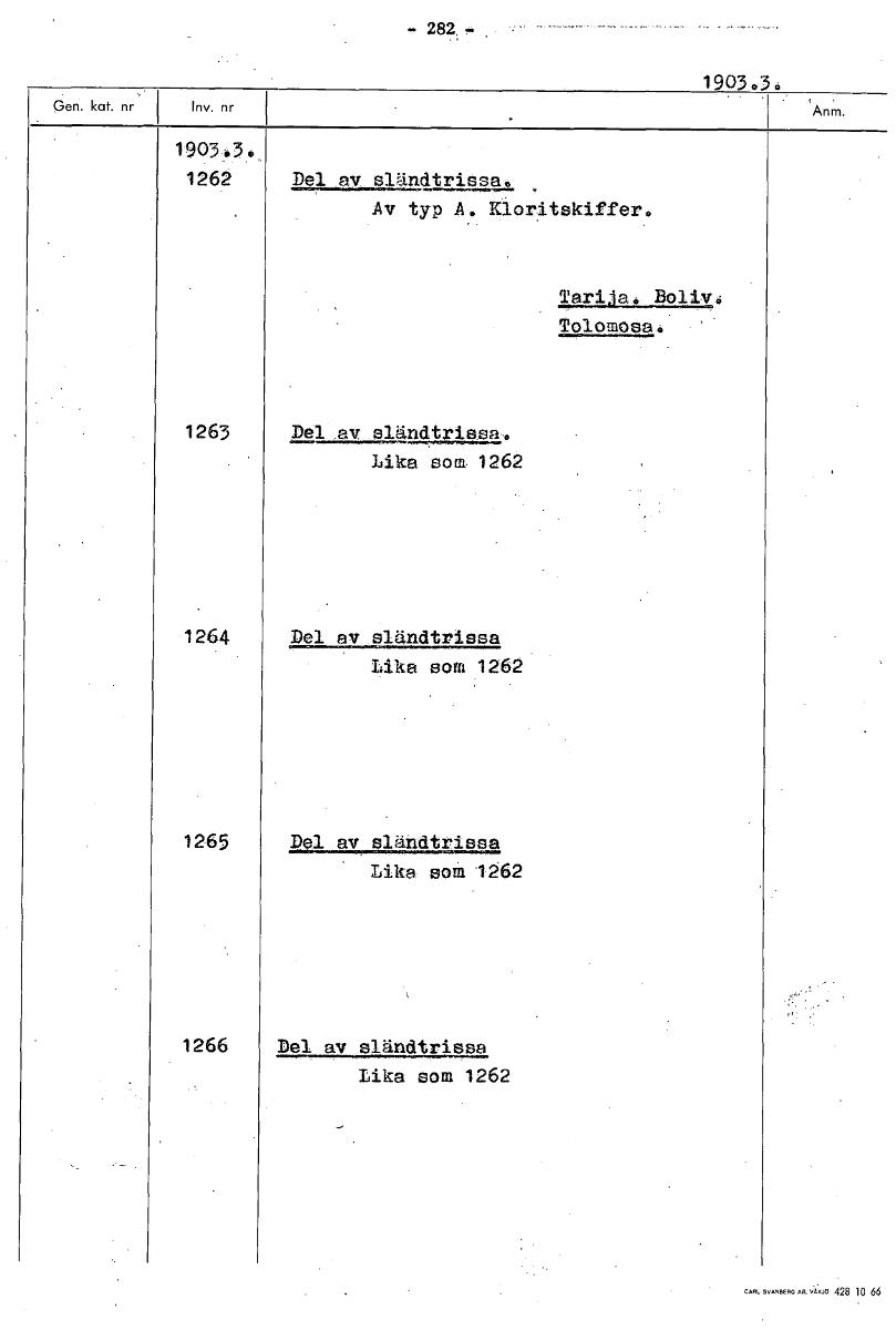 • 1903,3. 1903,3„, 1262 Del av sländtrissa, Av typ A. Kloritskiffer. ISI£111219.1114 Tolomosa. 1263 Del av sländtrissa. Lika som 1262 1264 Del av sländtrissa Lika som 1262 1265 Del av sländtrissa Lika s... Visa hela