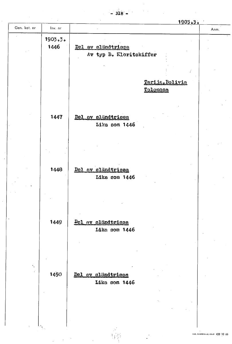 • - 31$• 1903:Ye, ' 1903k34 1446 Del av sländtrissa Av typ B. Kloritskiffer .arUa0 Boklua 1219222ft 1447 Del92 Lika som 1446 , 1448 12£1.93-214adILLWUI Lika som 1446 1449 Del av sländtrissa Lika som 144... Visa hela