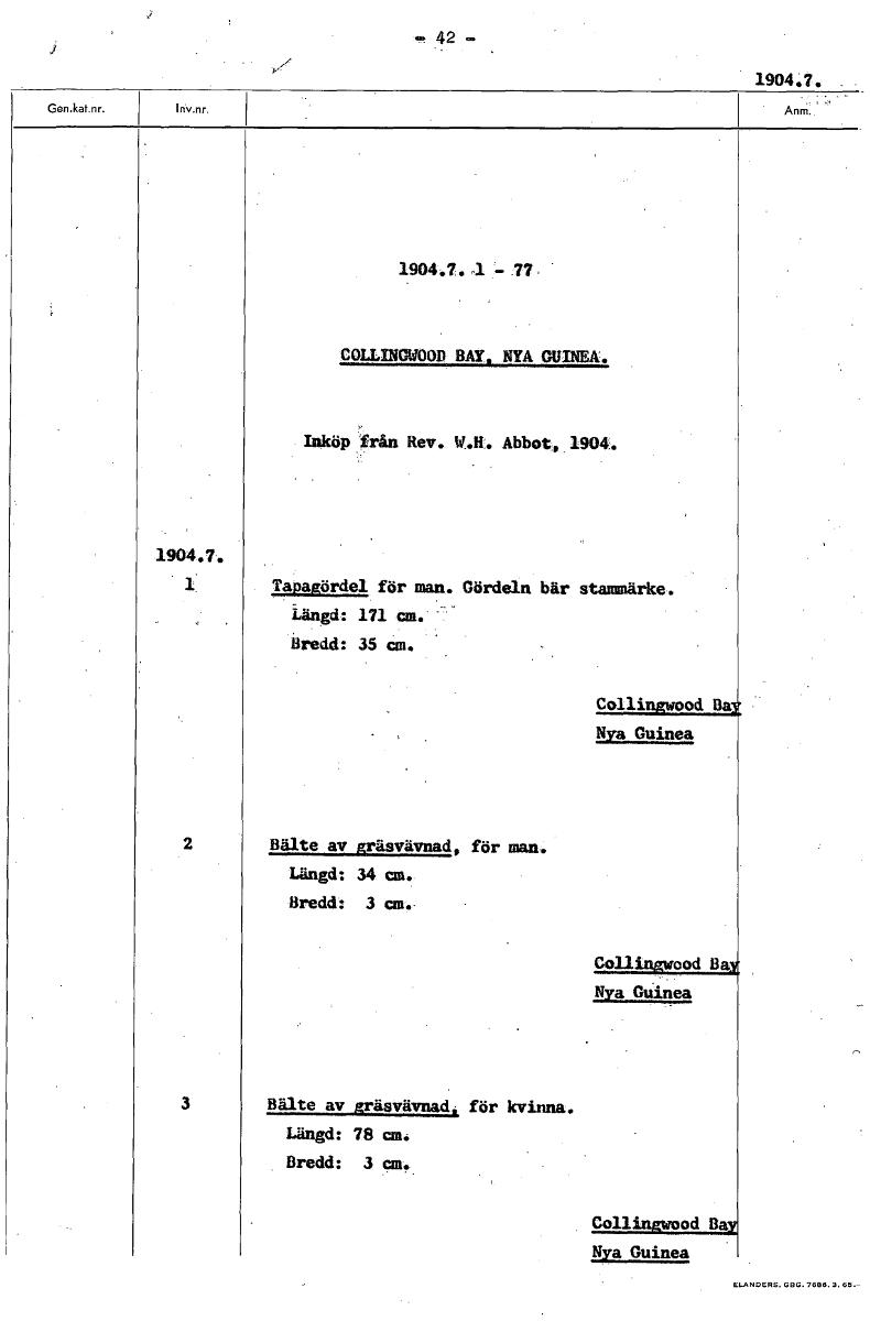 • 42 1904.7. 1904.7.1 -.77. COLLINGWOOD BAY, NYA GUINEA. Inköp "från Rev. W.H. Abbot, 1904. 1904.7. Tapagördel för man. Gördeln bär stammärke. Längd: 171 cm. Bredd: 35 cm. Colli god Ba Nya Guinea 2 Bält... Visa hela