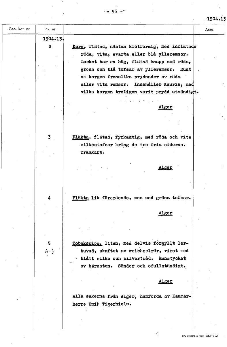 1904.13 19'04.13 2 Krm, flätad, nästan klotformig, med infläta• röda, vita, svarta, eller blå ylleremsor. Locket har en hög, flätad knapp med röda, gröna och blå tofsar av ylleremsor. Runt om korgen franslika prydnader av röda eller vita remsor. Innehåller Kauris, me vilka korgen troligen varit prydd utvändi t. Alger: Fläkta, flätad, fyrkantig, med röda och vita silkestofsar kring de tre fria sidorna. Träskaft. Alger, Fläkta lik föregående, men med gröna tofsar. Alger 5 Tobaksnipa, liten med delvis förgyllt ler- A -5 huvud, skaftet av weicheelrör, virat med blått silke och silvertråd. Munstycket av bärnsten. Sönder och ofullständigt. Alger Alla sakerna från Alger, hemförda av:Kammar- herre Emil.Tigerhielm. [ocr]
