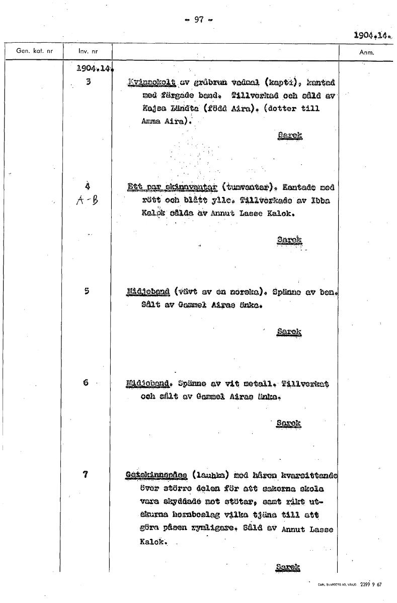 x-97® 190444^. 190444 3 ko rabrun Vadmal (kaptd)0 kantad ned g'ärgade band° Tillverkad Och oaid av Kajsa Itindta (född Aira). (dotter till Arma Aira).- P31~8,91,4å,å2at,•tumVanter)4› Rattade mod rött sek blatt 'ylle° TillVerkade av lbba Kapk: talda av Annut Lasse Kalok. 5 yid.lebend (vävt av on neroka). Spänne ev bon. Sålt av Gamma AlXne anka. e av vit metall, Tillverka och salt av Gannel iras änka. 7 Gopzikinnepdeq (1. .-u) ned baren kvareittanä övsr starrs 4Sien för att sakerna skola vara skyddade not stötar, samt rikt ut- Skurna hornbeslag vilka tjäna till att "ra päsen rytligareo Båld av Annut Lasse Kalok, [ocr]