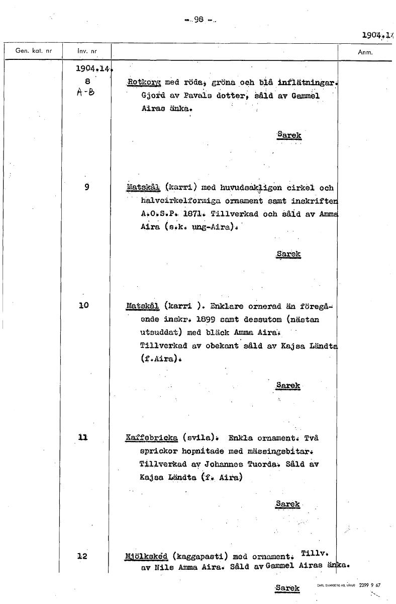 1904.1/ 1904.11k Rotkorg med röda; gröna och blå inflätningar A- -b Gjord av Pavals dotter; Såld av Gammel Airas änka. 8arek 9 Metskål (karri) med huvudeakggen cirkel och halvcirkelformiga ornament samt inskrifte A.O.S.P: 1871h Tillverkad och såld av Amm Aira (sek: nne-Aira):. .,Sarek 10 Idatekål (karri ): Enklare ornerad än föregå- ende inskr: 1899 samt dessutom (nästan utsuddat) med bläck Amma Aira: Tillverkad av obekant såld av Kaj sa Ländt (f:Aira): Sarek Kaffebricka (svila)h Enkla ornament: Två sprickor hopnitade med mässingebitari Tillverkad av Johannes Tuorda Såld av Kajsa Ländta (f. Aira) 8arek 12 Ejölksked (kaggapaeti) med ornament: Tillvå av Nils Amma Aira. Såld aVGammel Airas Barek [ocr]Stäng