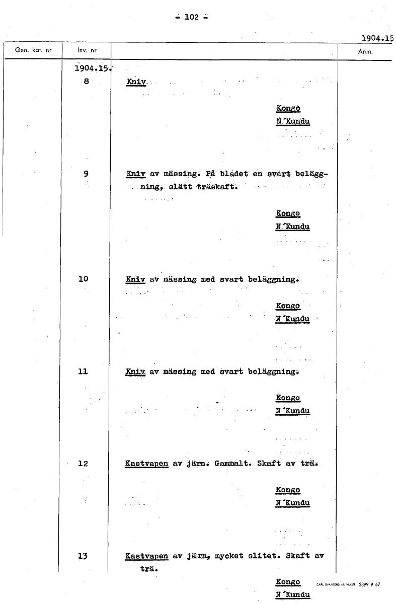 • 102 1904a5 190445, e Kniv- Kongo leKundu 9 Kniv av mässing. På bladet en svårt belägg- ninSih. slätt träSkaft. ' Kongo L'Kundu 10 Kniv av MäsSing med svart beläggning. Kongo 1V'Kundu 11 Kniv av mässin... Visa hela