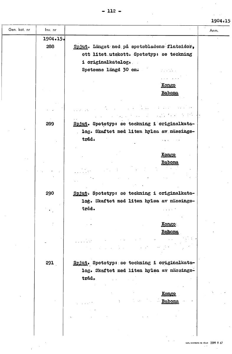 • - 112 - 1904.15 1904.15 288 Spjut. Längst ned på spetsbladens fiatsidor, ett /itet utskott. Spetstyp: se teckning i originalkatalog. Spetsens längd 30 cm; Kongo Baboma 289 Spjut. Spetstyp se teckning ... Visa hela