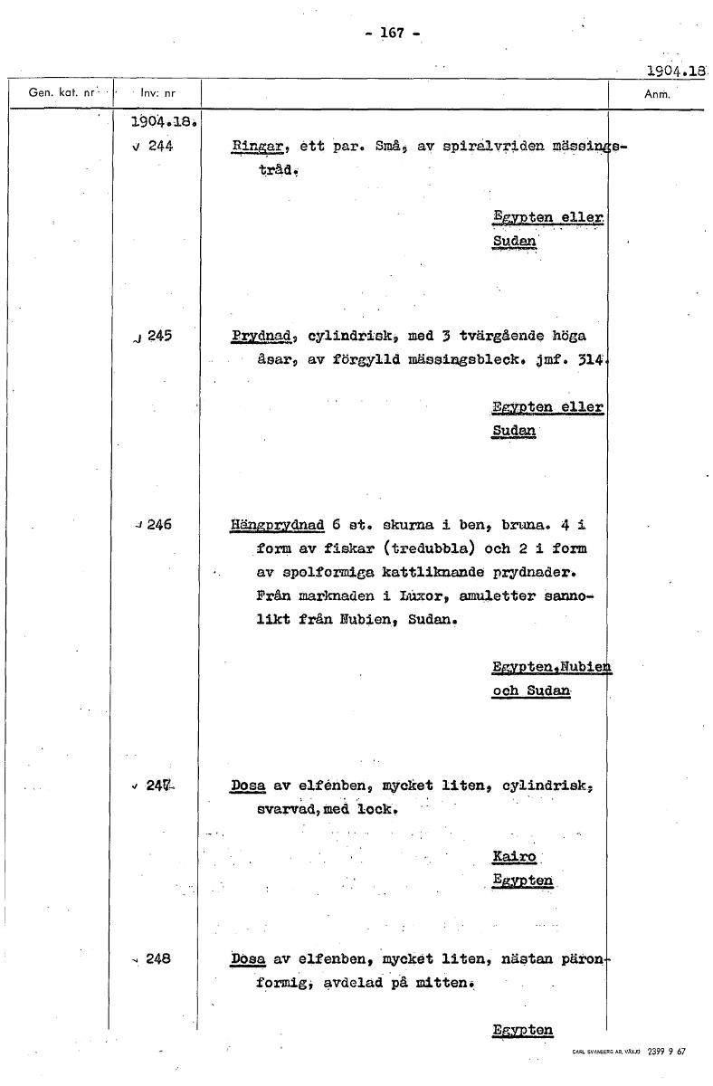 - 167 - 1904.18 1904.18. 244 flin ar, ett par. Små, av sPiravrden mässl trådt älapten eller Sudan 245 ly" cylindrisk, med 3 tvärgående höga åsar, av förgylld mässingsbleck. jmf. 314 4222.199.11ä£ Suda...