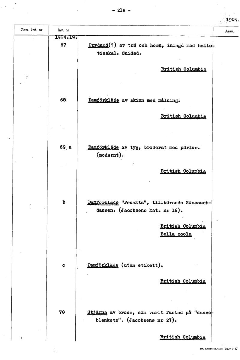 - 218 - 1904, 1904.19. 67 Prydnad(?) av trä och horn, inlagd med halio tisskal.. Snidad. British Columbia 68 Damförkläde av skinn med målning. British Columbia 69 a Damförkläde av tyg, broderat med pä...