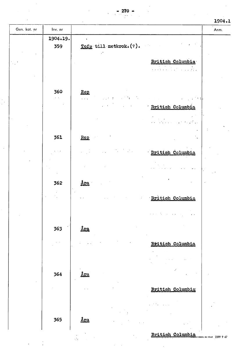 • • 270 = 1904.1 1904.19. 359 Tore till metkrok.(?). British Columbia' 360 Re 'British Columbia """ 361 Re British Columbia 362 Ära British Columbia 363 Ära British Columbia 364 Ara British Columbia 365... Visa hela