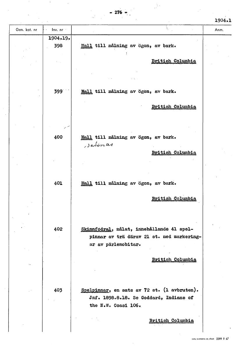 276 ‘s, 1904.1 1904.19. 398 Mall till målning av ögon, av bark. British Columbia• 399 Mall till målning av ögon, av bark. British Columbia 400 Mall till målning av ögon, av bark. British Columbia 401 ...