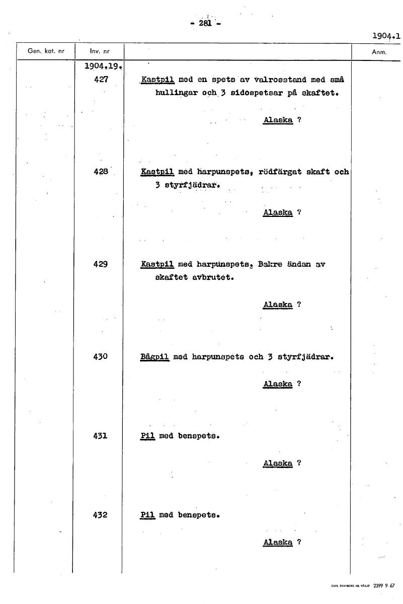 • 281 - 1904.1 1904.19. 427 Ildiplapmed en spets an valrosstand med små hullingar 001,3 eidospetsar på skaftet. Alaska ? 428 Kastpil Med harpunspetst rödfärgat skaft och 3 stytfjädrat. Alaska ? 429 ,Kas... Visa hela