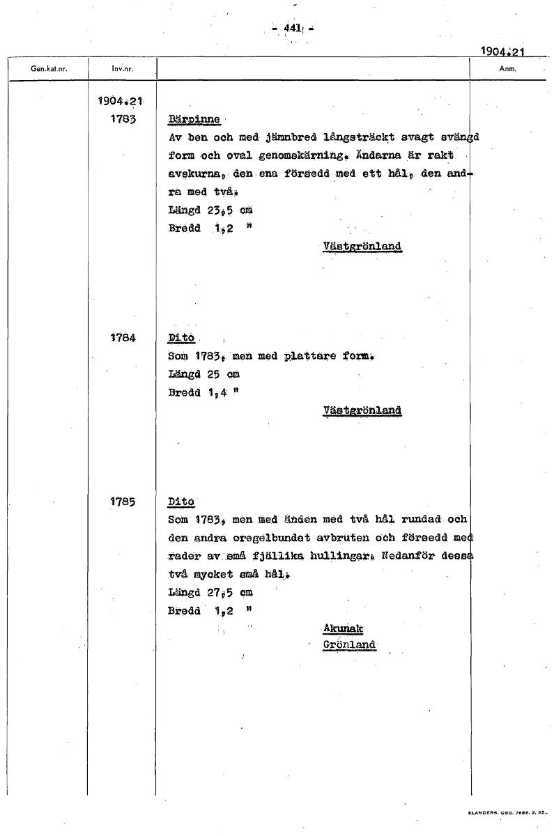 441; 1904:21 1904.21 1783 Bärpinne Av ben och med jämnbred långsträckt svagt ovänj d form •och oval genomskärning.. Ändarna är rakt avskurnavden ena försedd Ted ett håla den and ra med två. Längd 2305 cm Bredd 192 Västgrönland 1784 Ditö. Som 1783, men med plattare form.' Längd 25 am Bredd 194 n Västkrönland 1785 Dito Som 17859 men Mod änden med två hål rundad och den andra oregelbundet avbruten Och försedd me rader av:Jamå fJällika hullingar. Nedanför degs två mycket emot. hål. Längd 2795 am Bredd 192 " Alcuriak Grönland. [ocr]Stäng