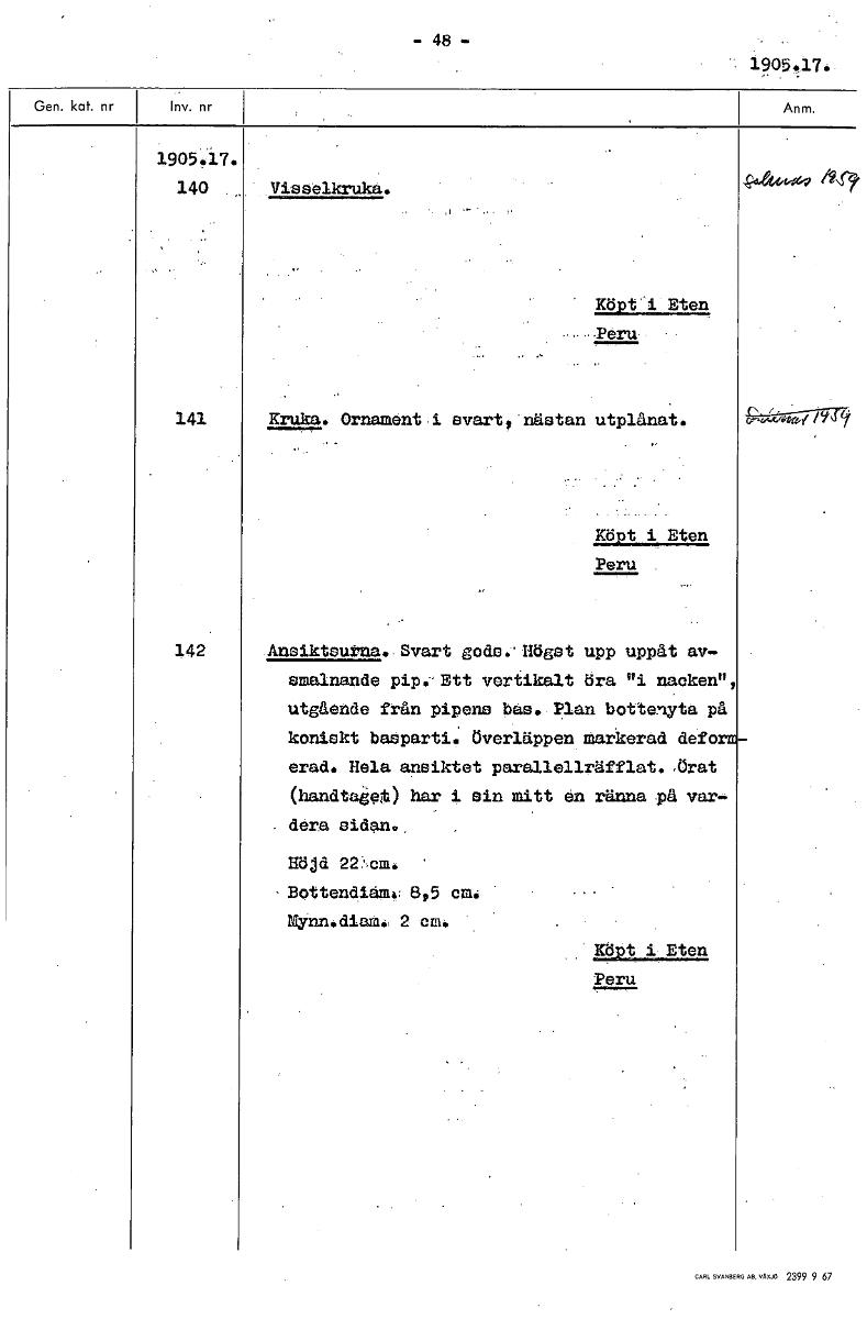 - 48— 1905.17. 1905.17. 140 . Visselkruka. ,94444~ /94'? Köpt 'i Eten ---Peru 141 Kruka. Ornament i svart 'nästan utplånat. P—÷zrig7e7-79-19 Köpt i Eten Peru . 142 Ansiktsutna. Svart gods.' Högst upp ...Visa hela