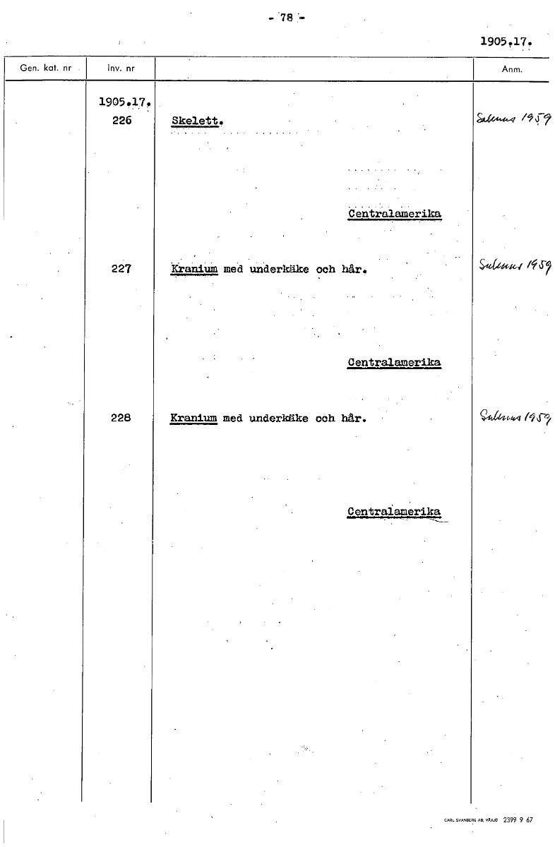 • -78 1905.17. 1905.17s 226 Skelett. Centralamerika 227 itrailiim med underkäke och hår. 544~1 3", Centralamerika 228 Kranium med underkäke och hår. d46. Centralamerika [ocr]