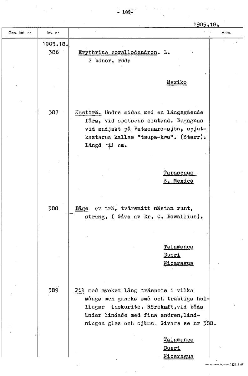 - 184- 190 5, 18. 1905.18: 386 Erythrina corallodendron, L. 2 bönor, röda Mexiko 387 Kastträ. Undre sidan med en längsgående fåra, vid spetsens slutrand. Begagnas vid andjakt på Patzenaro-sjön, spjut-...
