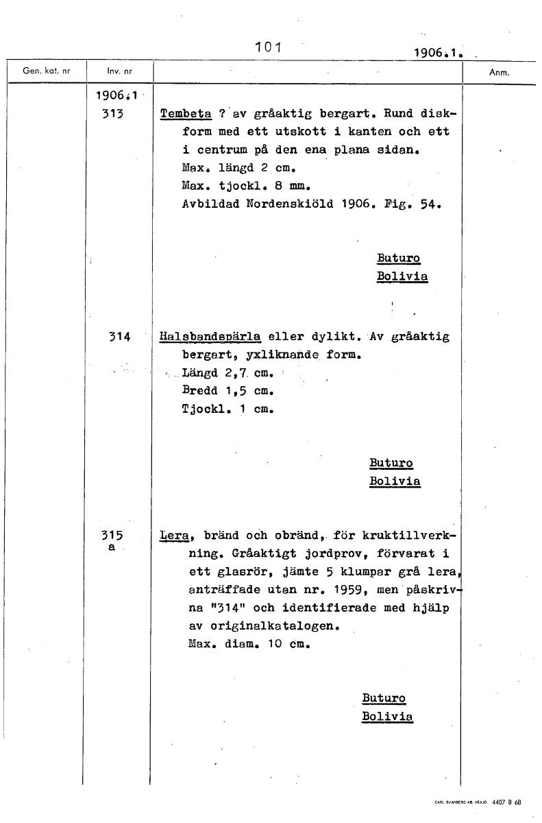 101 1906.1. 1906.1 313 Tembeta ? av gråaktig bergart. Rund disk- form med ett utskott i kanten och ett i centrum på den ena plana sidan. Max. längd 2 cm. Max. tjockt. 8 mm. Avbildad Nordenskiöld 1906. Fig. 54. Buturo Bolivia 314 HalsbandspArla eller dylikt. Av gråaktig bergart, yxliknande form. Längd 2,7 cm. Bredd 1,5 cm. Tjockt. 1 cm. Buturo Bolivia 315 Lera, bränd och obränd, för kruktillverk- a ning. Gråaktigt jordprov, förvarat i ett glasrör, jämte 5 klumpar grå lera anträffade utan nr. 1959, men påskriv na "314" och identifierade med hjälp av originalkatalogen. Max. diam. 10 cm. Buturo Bolivia [ocr]Stäng
