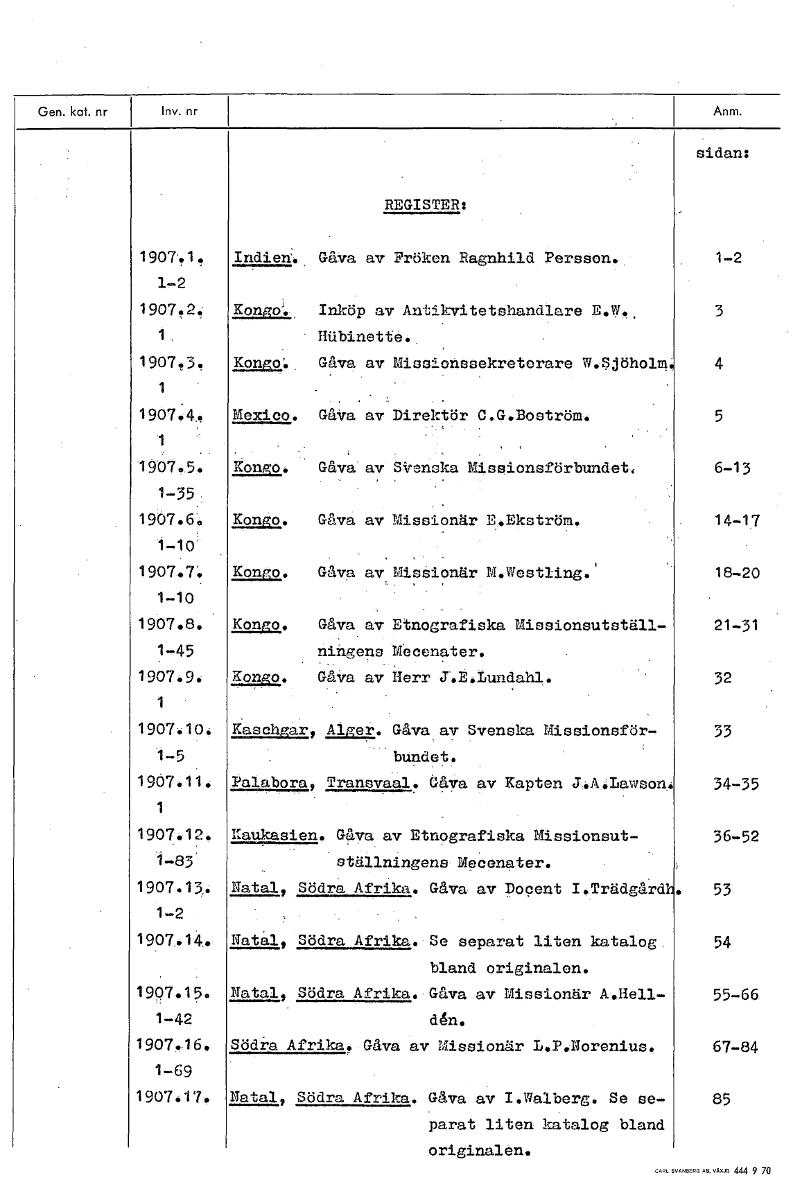 sidan: REGISTER: 1907.1. Indien, Gåva av Fröken Ragnhild Persson. 1-2 1-2 1907.2. Kongo: Inköp av Antikvitetshandlare E.W. 3 1, HUbinette. 1907.3. Kongo; Gåva av Missionssekreterare W.,,jöholm 4 1 • 1...