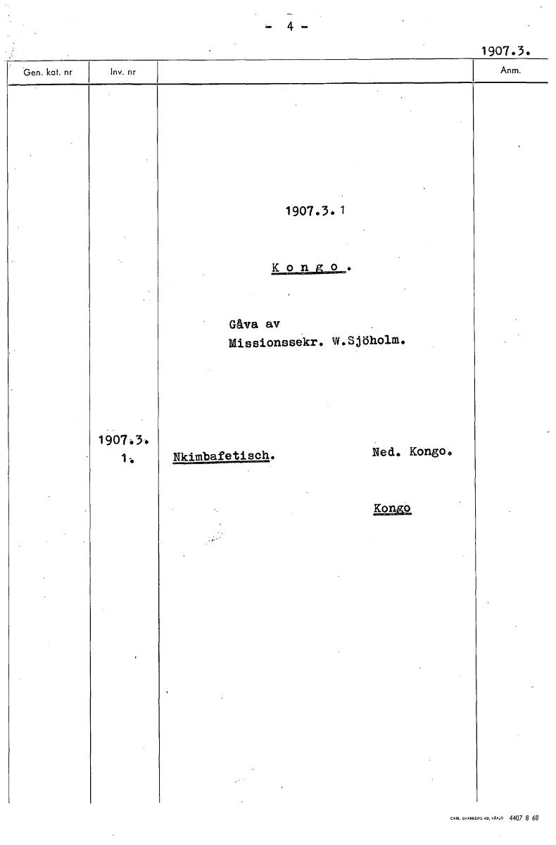 • 4 1907.3. 1907.3.1 Kongo. Gåva av Missionssekr. W.Sjöholm. 1907434 Nkimbafetisch. Ned, Kongo. Kongo [ocr]