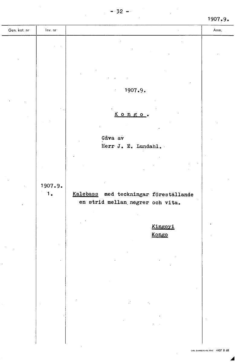 • 32 1907.9. 1907.9. Kongo. Gåva av Herr J. E. Lundahl. 1907.9. 1. Kalebass med teckningar föreställande en strid mellan negrer och vita. Kingoyi Kongo [ocr]