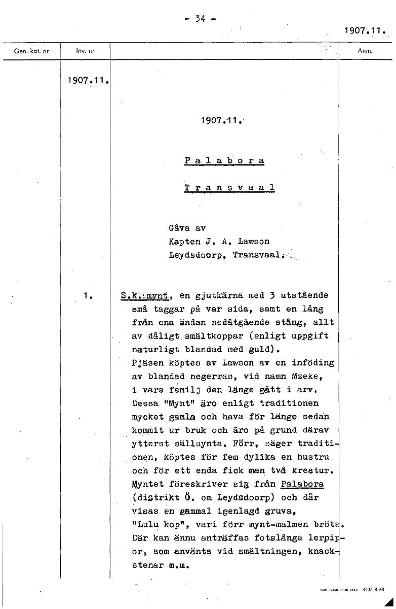 -34- 1907.11. 1 907 . 1 1 1907 .11 .. Palabora Transvaal Gåva av Kapten J. A. Lawson Leydsdoorp, Transvaal,-- 1. S.k.mynt, en gjutkärna med 3 utstående små taggar på var sida, samt en lång från ena ä...