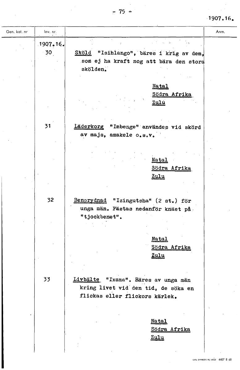 75 .1907.16. 1907.14. 30 Sköld "IsihlangO",'bäreS i kidg av dem, .som ej ha kraft nog att bära den stor- skölden. Natal Södra Afrika Zulå 31 Läderkorg "Imbenge"'användes vid skörd av majs, amakele o.s...Visa hela