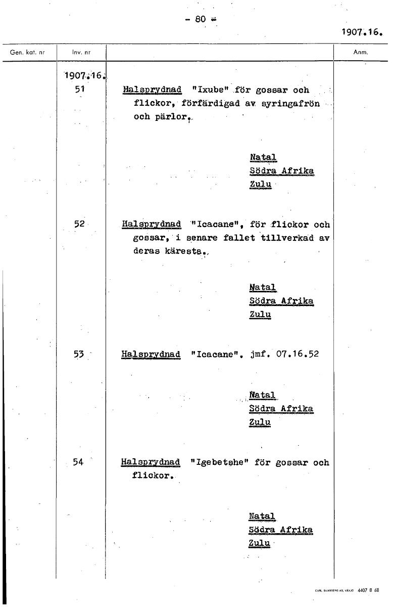 • -804;1 1907,16. 190741 51 Halsprydnad "Ixube" för gossar och flickor, förfärdigad av syringafrön och pärlor._ Natal Södra Afrika Zulu: 52 Halsprydnad "Icacane", för flickor och gossar, i senare fallet... Visa hela
