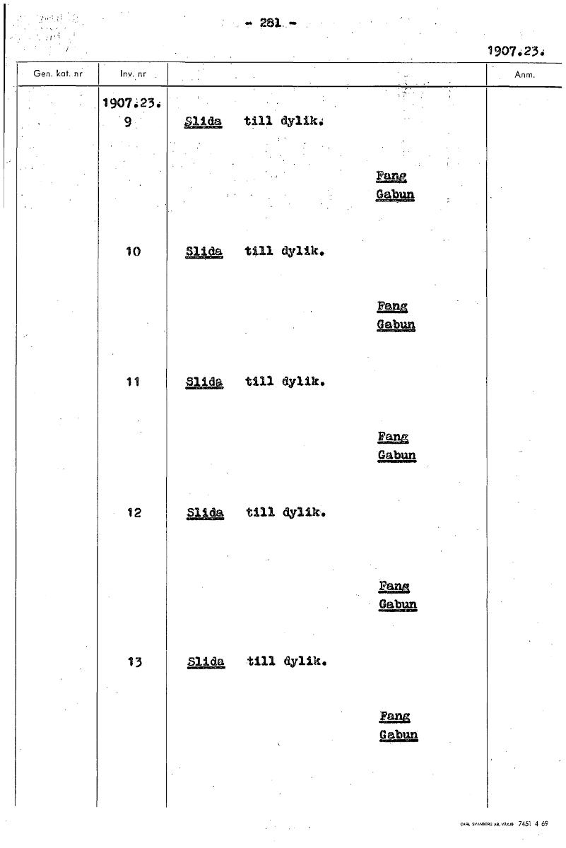 • 281., - 1907.23. 1907:23: 9 Slida till dylik: Fan Gabun 10 Slida till dylik. 113_1am Gabun 11 atiä, till dylik. Lam Gabun 12 Slida till dylik. Gabun 13 Slida, till dylik. G abun [ocr]