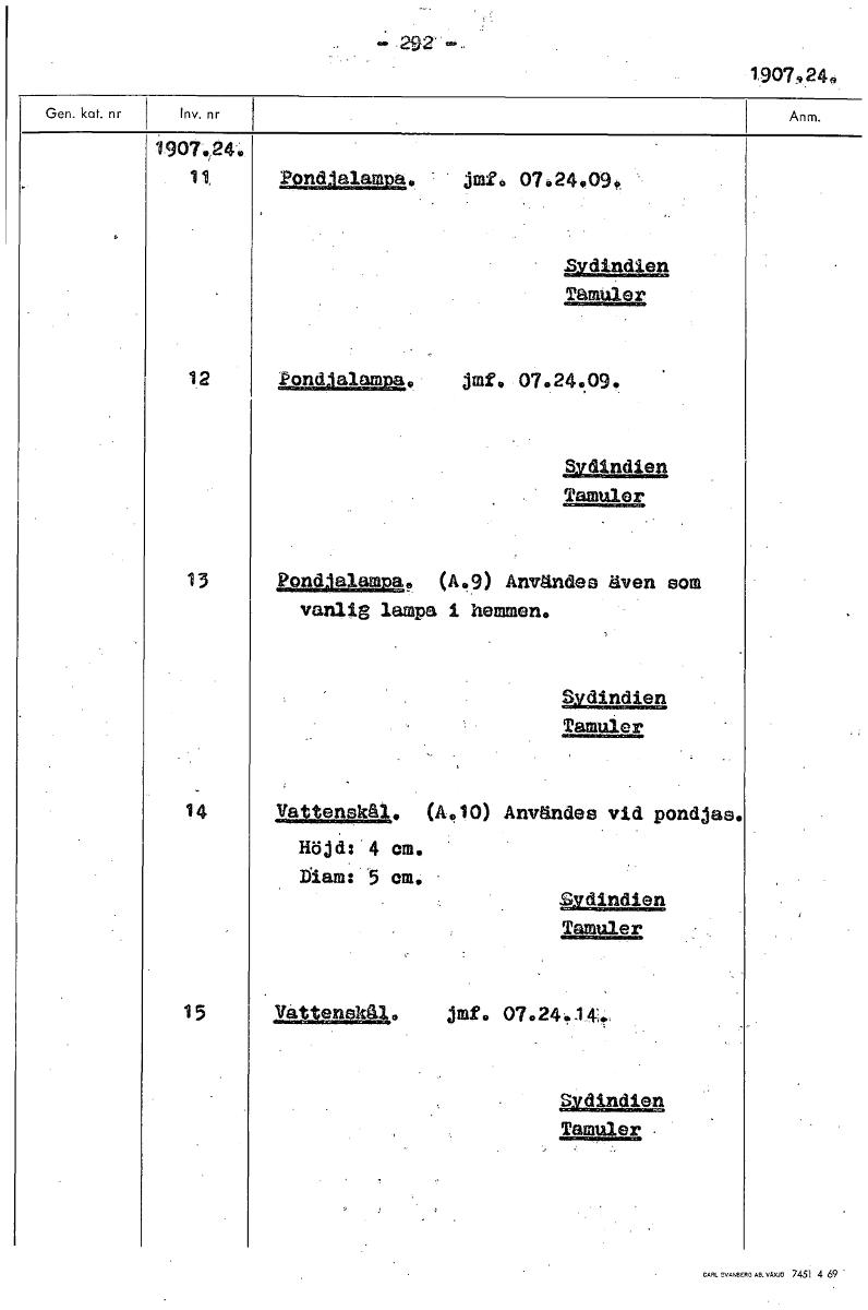 • 292' 1,907 24 1907.24. 11, PondJalamDa. jmf. 07.24 09. Sydindien Tamuler 12 Pondialampa. jmf. 07.24.09. Sydindien Tamuler 13 PonNalampa. (A.9) Användes även som vanlig lampa 1 hemmen. Sydindien Tamule... Visa hela