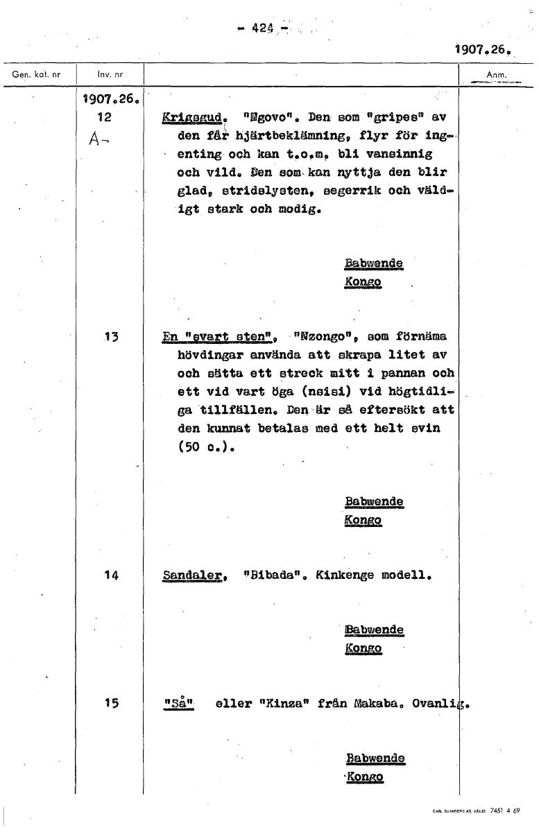 424. 1907.26., 1907 26. 12 Krigsgud, nOgovon. Den som "gripes" av A den får hjärtbeklämning, flyr för ing- enting och kan t.o,m, bli vansinnig och vild. Den soakan nyttja den blir glad, stridslysten, segerrik och väld- igt stark och modig. Babwende 13 En "ovant sten", "Nzongon, som förnäma hövdingar använda att skrapa litet av och sätta ett streck mitt 1 pannan och ett vid vart öga (nsisi) vid högtidli- ga tillfällen. Dewär så eftersökt att den kunnat betalas med ett helt avin (50 0.). Babwende Kongo 14 Sandaler, nibadan. Kinkenge modell. Babwende 5.52M9. 15 "Sån eller "Kina" från Makaba. Ovanli Babwende Kongo [ocr]
