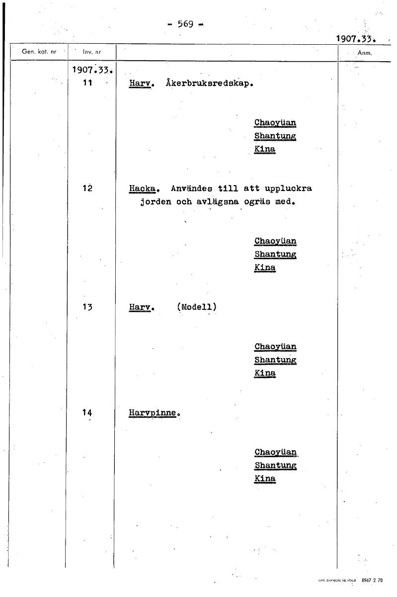 • - 569 1907.33. 1907.33. 11 Harv, Åkerbruksredskap. Chaoyuan Shantung Kina 12 Hacka. Användes till att uppluckra jorden och avlägsna ogräs med. Chaoyilan Shantung Kina 13 Harv. (Modell) Chaoytian. Shan... Visa hela