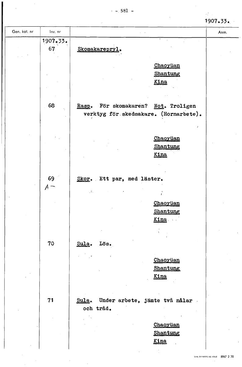 • 1907.33. 1907,3 67 Skomakarepryl. Chaovtian Shantung Kina 68 Rasp, För skomakaren? Not. Troligen verktyg för.skedmakare. (Hornarbete). 0haovilan Shantung Kina 69 Skor. Ett par, med läster. A Chaoyilan... Visa hela