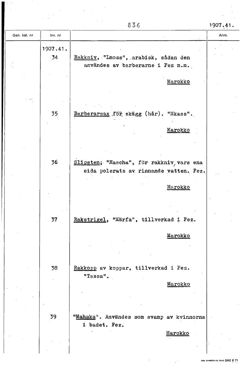 836 1907.41. 1907.41. 34 Rakkniv, "Lmoss", arabisk, sådan den användes av barberarns i Fez m.m. Marokko 35 Barberarsax ,för. skägg (hår) . "Mkass". Marokko 36 Slipsten;: uHaschan, för rakkniv/vars ena sida polerats av rinnande vatten. Fez. Marokko 37 Rakstrigel, "Märfa", tillverkad i Fez. Marokko 38 Rakkomp av koppar, tillverkad i Fez. "TRssa". Marokko 39 "Meshaka". Användes som svamp av kvinnorna i badet. Fez. Marokko [ocr]