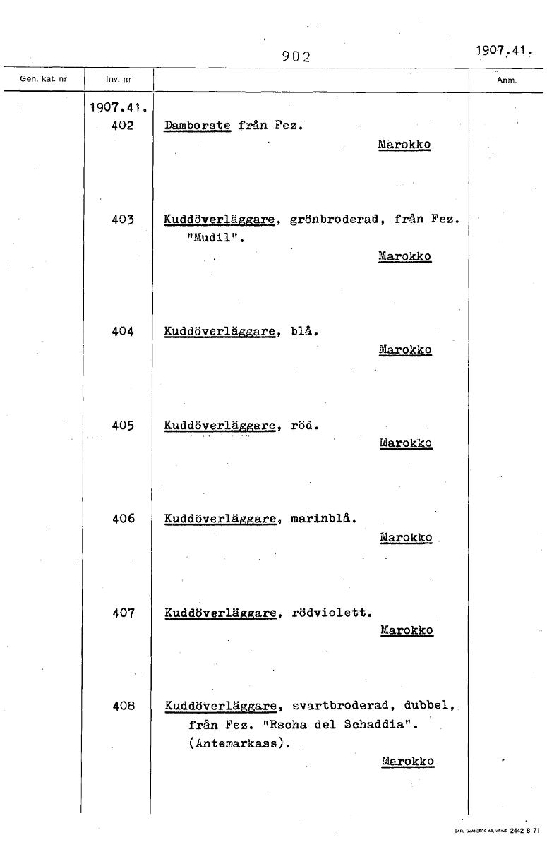 902 1907.41. 1907.41. 402 Damborste från Fez. Marokko 403 Kuddöverläggare, grönbroderad, från Fez. "Mudil". Marokko 404 Kuddöverläggare, blå. Marokko 405 Kuddöverläggare, röd. Marokko 406 Kuddöverläggare, marinblå. Marokko 407 Kuddöverläggare, rödviolett. Marokko 408 Kuddöverläggare, svartbroderad, dubbel, från Fez. "Rscha del Schaddia". (Antemarkass). Marokko [ocr]
