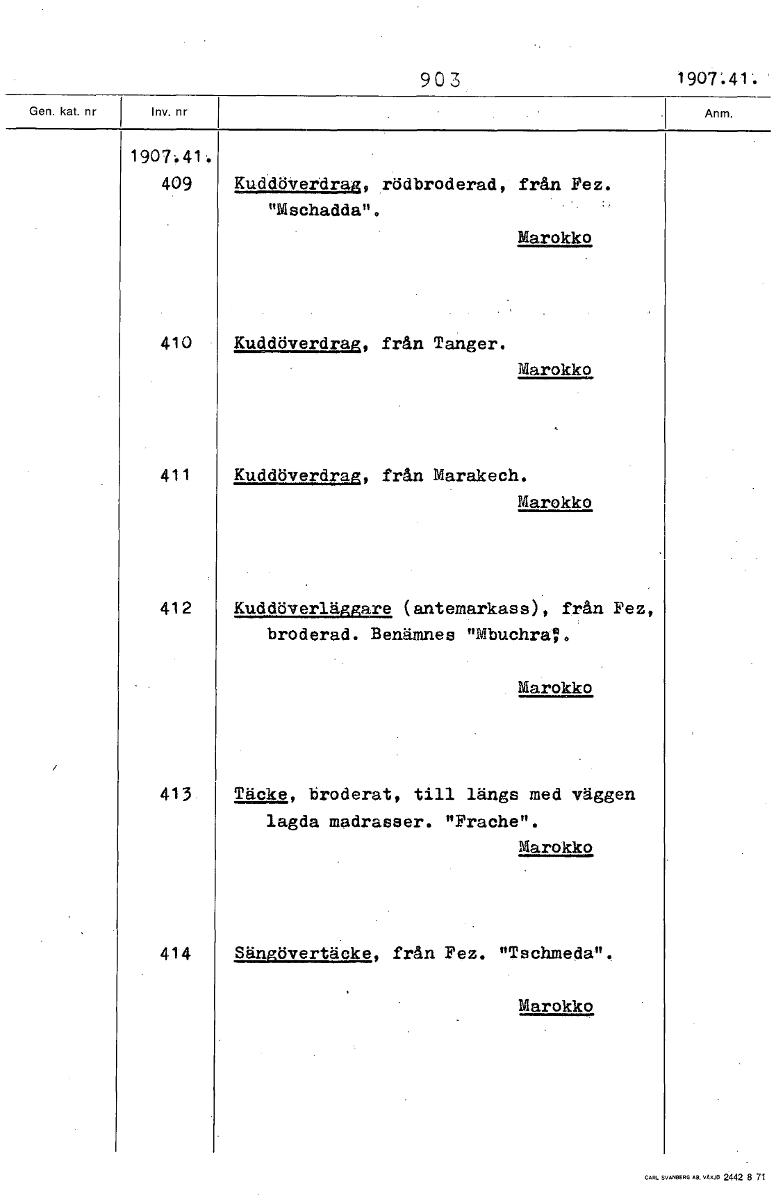 90 3 1907.41'. 1907.41 409 Kuddöverdrag, rödbroderad, från Fez. "Mschadda". Marokko 410 Kuddöverdrag, från Tanger. Marokko 411 Kuddöverdrag, från Marakech. Marokko 412 Kuddöverläggare (antemarkass), från Fez, broderad. Benämnes "Mbuchr4. Marokko 413 Täcke, broderat, till längs med väggen lagda madrasser. "Frache". Marokko 414 Sängövertäcke, från Fez. "Tschmeda", Marokko [ocr]