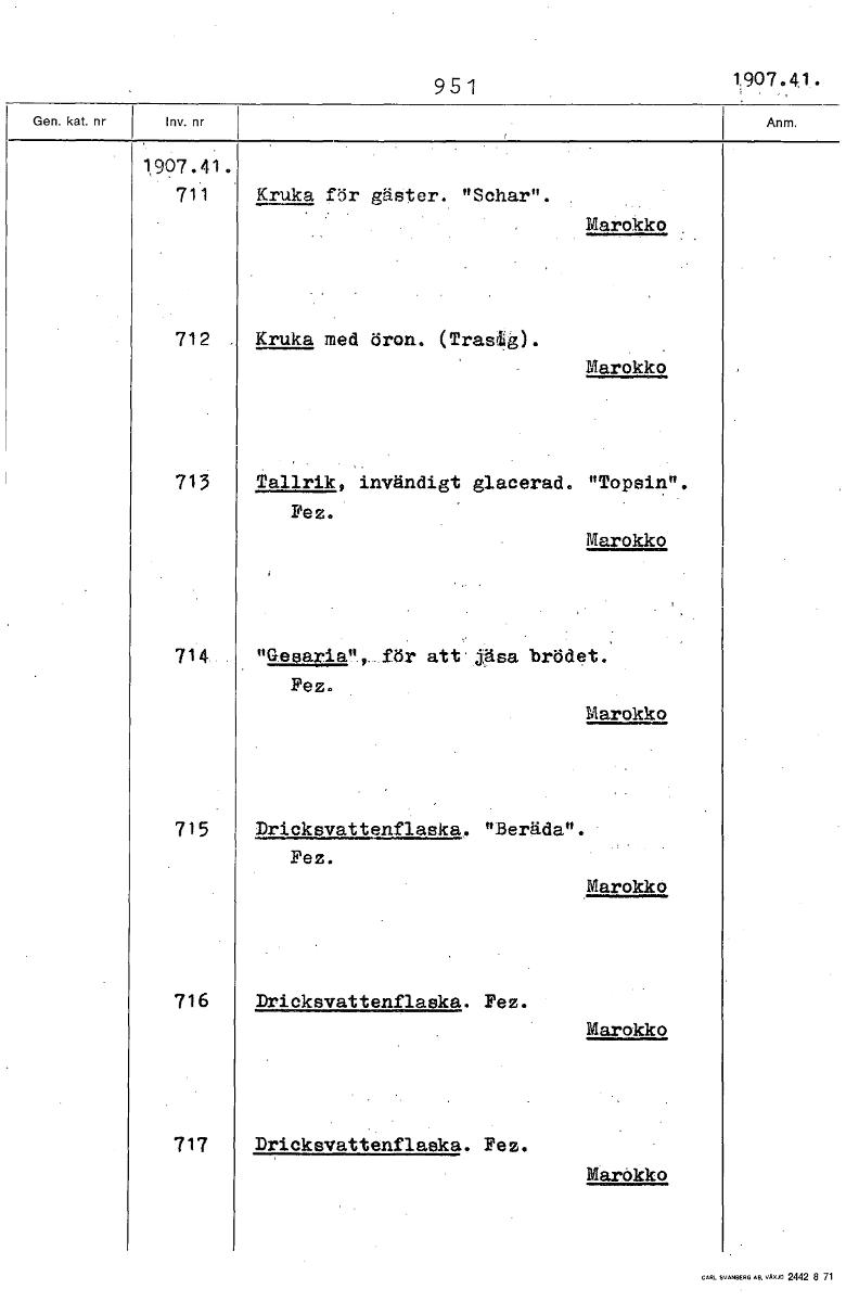 • 951 1.907.4 1. 1907.41 . 711 Kruka för gäåter. "Sehar". Marokko . 712 Kruka med öron. (Trasg). Marokko 713 Tallrik, invändigt glacerad. "Topsin". Fez. Marokko 714 "Genaria", ._för att jäsa brödet. Fez... Visa hela