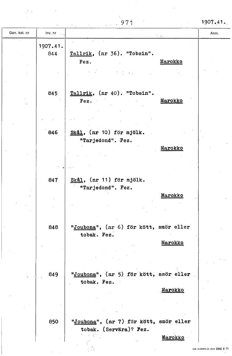971 1907.41,.. 1907.41. 844 Tallrik, (nr 36). "Tobsin". Fez. Marokko 845 Tallrik, (nr 40). "Tobsin". Fez. Marokko 846 Skål, (nr 10) för mjölk. "Tarjedond".-Fez. Marokko 847 Skål, (nr 11) för mjölk. "Tarjedond". Fez. Marokko 848 "Joubona", (nr 6) för kött, smör eller tobak. Fez. Marokko 849 "Joubona", (nr 5) för kött, smör eller tobak. Fez. Marokko 850 "Joubona", (nr 7) för kött, smör eller tobak. (Servära)? Fez. Marokko [ocr]