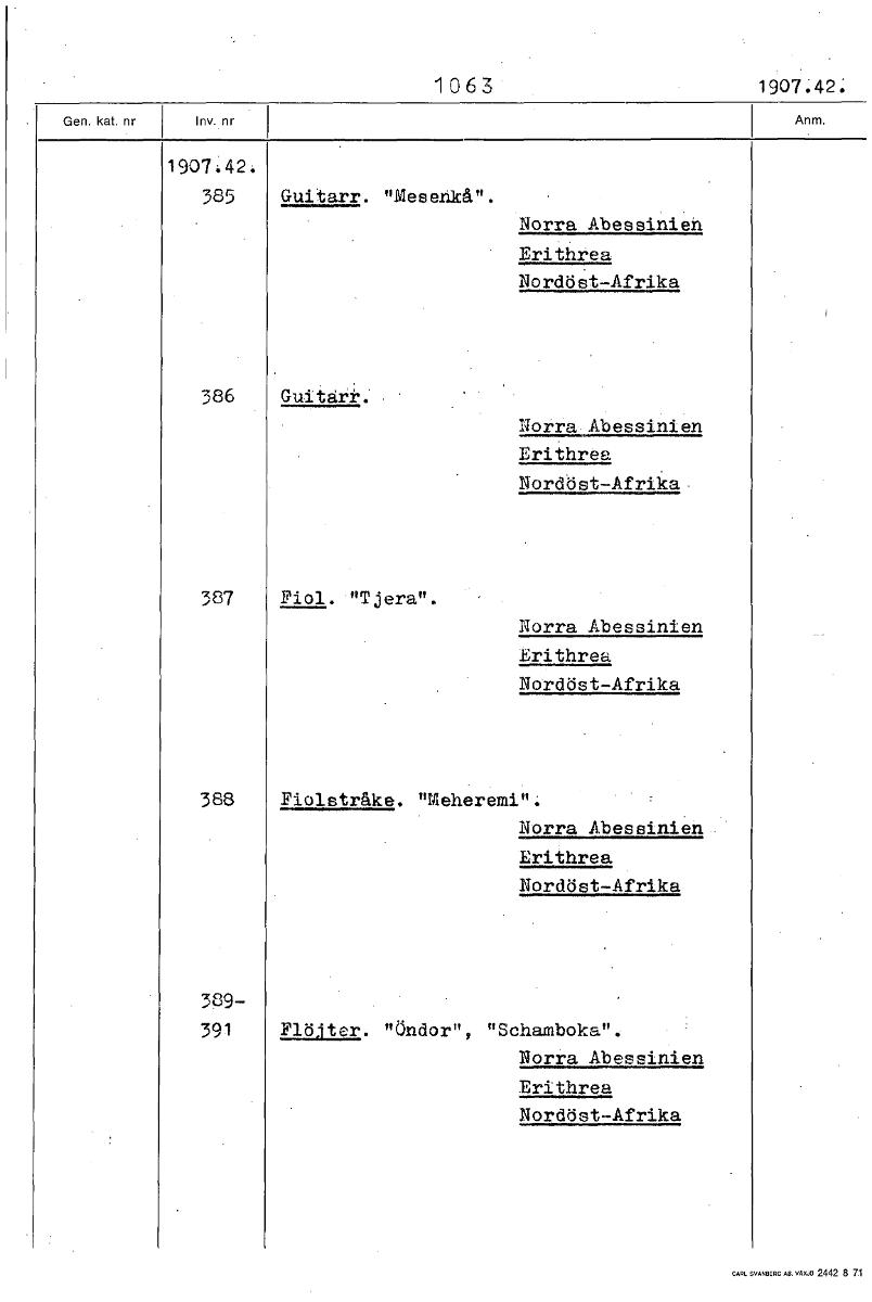 • 1063 1907:42: 1907142: 385 Guitarr. "Mesenkå". Norra Abessinien Erithrea Nordöst-Afrika 386 Guitårr. Norra Abessinien Erithrea Nordöst-Afrika 387 Fiol. "Tjera". Norra Abessinien Erithrea Nordöst-Afrik... Visa hela