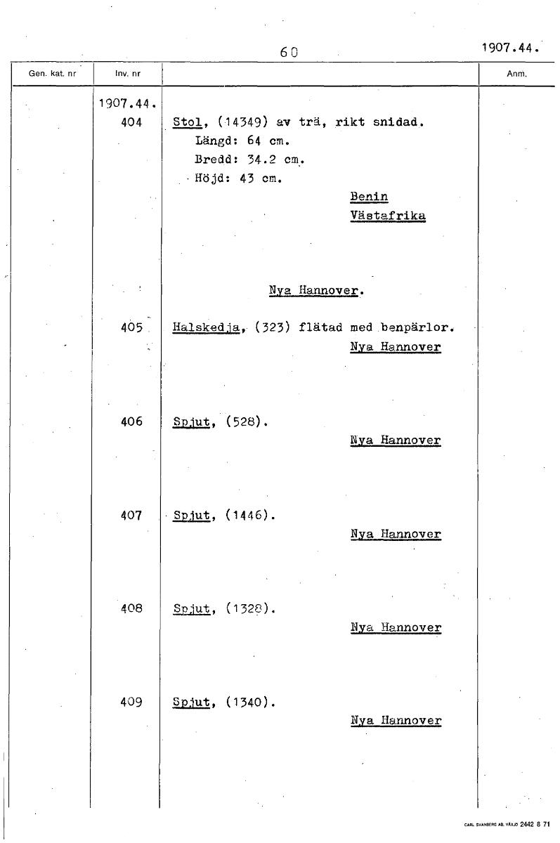 6 1907.44. 1907.44. 404 Stol, (14349) av trä, rikt snidad. Längd: 64 cm. Bredd: 34.2 cm. Höjd: 43 cm. Benin Västafrika Nya Hannover. 405 , Halskedja,• (323) flätad med .benpärlor, Nya Hannover 406 Spjut, (528). Nya Hannover 407 Spjut, (1446). Nya Hannover 408 Spjut, (1328). Nya Hannover 409 Spjut, (1340). Nya Hannover [ocr]