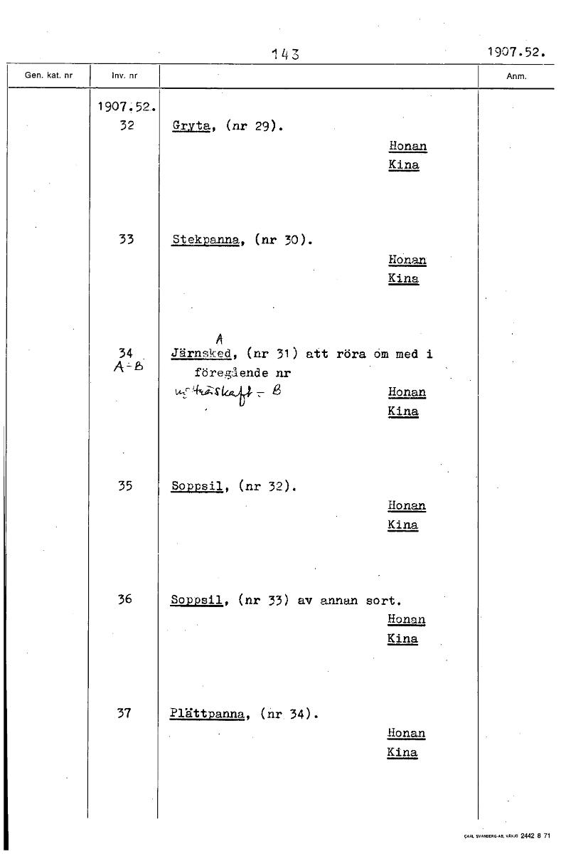 1 4 3 1907.52. 1907.52.. 32 Gryta, (nr 29). Honan Kina 33 Stekpanna, (nr 30). Honan Kina A 34 Järnsked, (nr 31) att röra öm med i föregående nr wyr4=4AZr 8 Honan Kina 35 Soppsil, (nr 32). Honan Kina 36 Soppsil, (nr 33) av annan sort. Honan Kina 37 Plättpanna, (hr 34). Honan Kina [ocr]