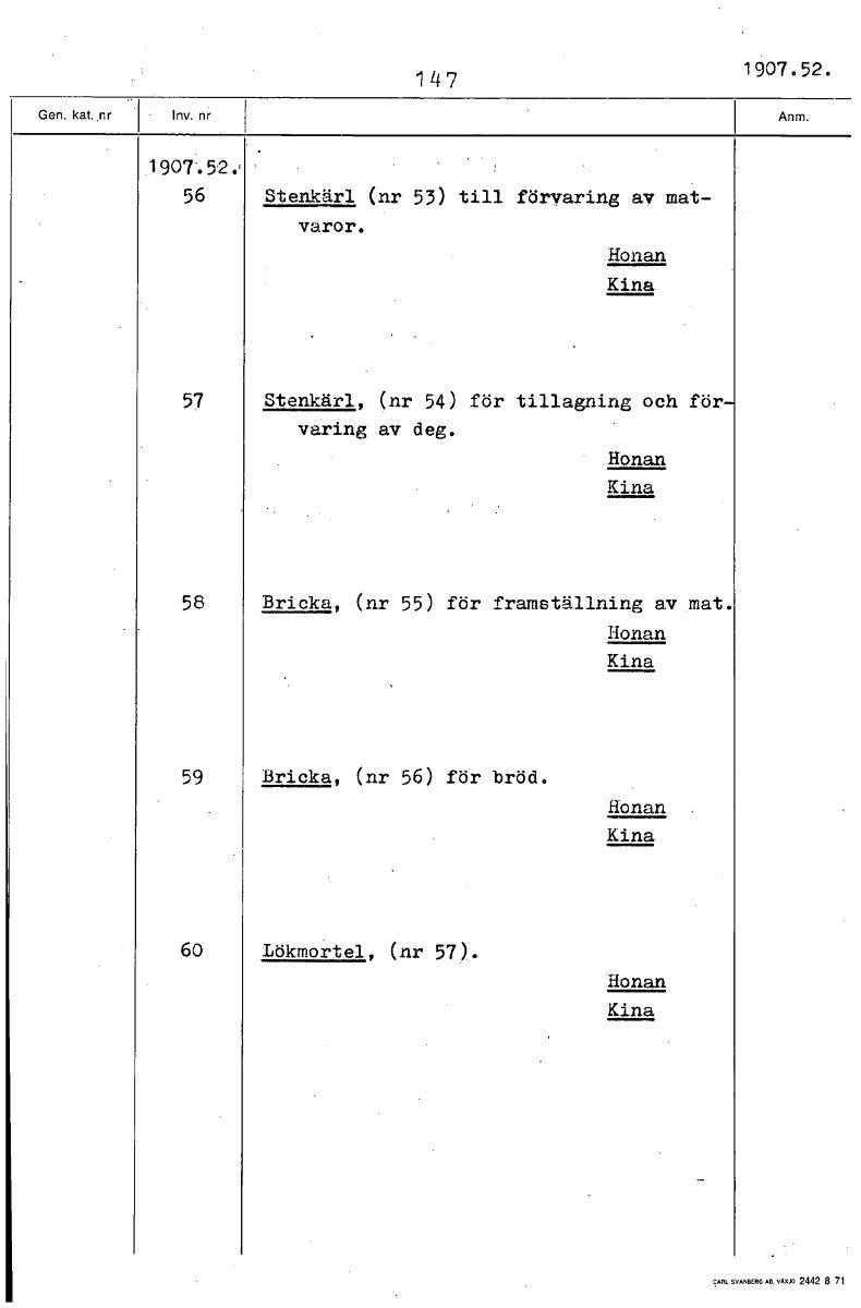 • 147 1907.52. 1907.52.i 56 Stenkärl (nr 53) till förvaring av mat- varor. Honan Kina 57 Stenkärl, (nr 54) för tillagning och för- varing av deg. Honan Kina 58 Bricka, (nr 55) för framställning av mat. ... Visa hela